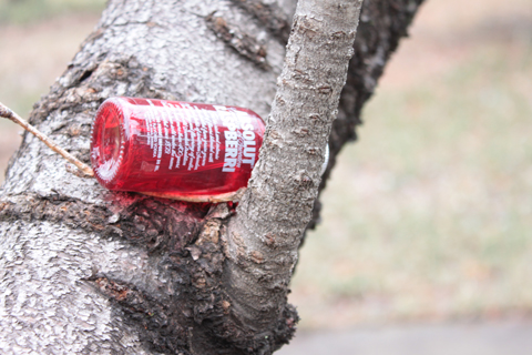 木に集まるみんな。木陰が出ない、鈍く白い天気。